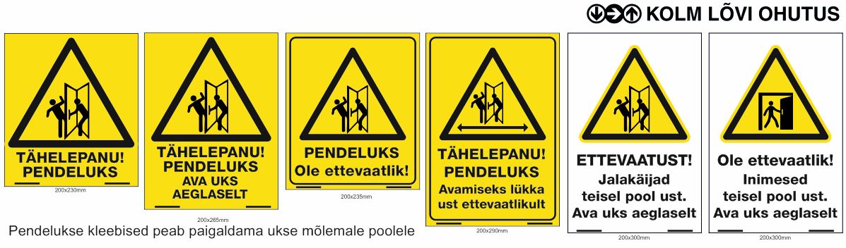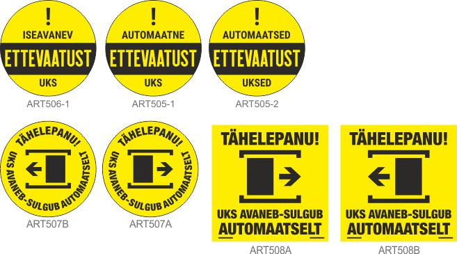 ART10509R (ümmargune) "Tähelepanu! Uks avaneb-sulgub automaatselt", ART10509T1Q (ruudukujuline) "Tähelepanu! Uks avaneb-sulgub automaatselt", ART10509T2P (püstine, pikema tekstiga) "Tähelepanu! Uks avaneb-sulgub automaatselt. Ära takista ukse liikumist!".