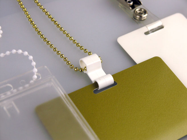 Lühike kuulkett (B) erinevate siltide kinnitamiseks (pikkus 100mm). Must pikk kuulkett (C) koos plastalusega töötöendi / kaelakaardi jaoks. Sama plastalus mustana (D) koos kroomitud pika kuulketiga töötõendi / kaelakaardi jaoks. Valge plastkuulkett (E) koos küljelt avaneva plasttaskuga töötõendi / kaelakaardi jaoks. Kuldne pikk kuulkett (F) koos kuulketiühendus (suurem pilt siin) lüliga mis aitab ühendada töötõendit / kaelakaarti otse kuulketi külge. Krokokinnitus (G) otse töötõendi / kaelakaardi külge. Kahele kaardile mõeldud ülaltavanev plasttasku (H) koos krokokinnitusega.