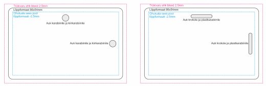 Failides on punase joonega märgitud trükivaru ulatus lõppformaadist. Musta joonega kaelakaardid/töötõendi lõppformaat. Sinise joonega on märgitud ohututsoon millest sisse poole paiguta olulised detaildi, tekstid, logogd ja värvipinnad. Lisaks on näidisel näidatud aukude võimalikud asetused nii horsontaalsetele kui ka vertikaalsetele kaartidele. Kui kaart pannakse plasttaskusse siis auku ei tehta ning selle asukohaga pole vaja ka arvestada.