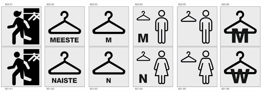 Pukeruum, buffet, rootsilaud, iseteenindusega söögikoht, köök, einestamis ruum, söömisruum, tehniline ruum, koristusvahendite ruum, suitsetamisruum, suitsetamiskabiin, pesumasin, pesupesemine. Suurus 93x93mm.