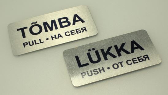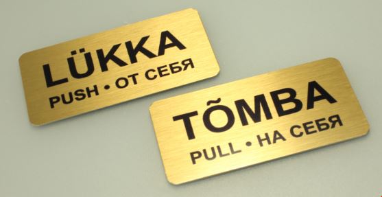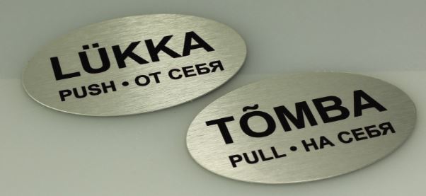Lükka-tõmba uksesildid erinevate disainide ja erinevates suuruses. Metallist ja kleebitavad. Lükka-tõmba märgid 2 kaupa komplektis 7.00+km (2 x 3.50+km) ja üksikult ostes ovaalse märgise hind 4.08+km. Tagaküljel 3M VHB laus teip.