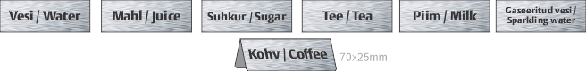 Metallist sildid laudadele näiteks toidlustus kohtades või koolitustele, catering teenuste firmadele (eesti ja ingliskeelsed vesi, kohv, tee, piim, suhkur, mahl, gaseeritud vesi jne). Suurus 70x25, 84x30mm, 112x40mm. Saame valmistada ka kliendi soovide kohaseid tekste ja suuruseid. Metallitoonid hõbedane ja kuldne + neile trükitavad poolläbipaistvad värvused (näidised meie kontoris).