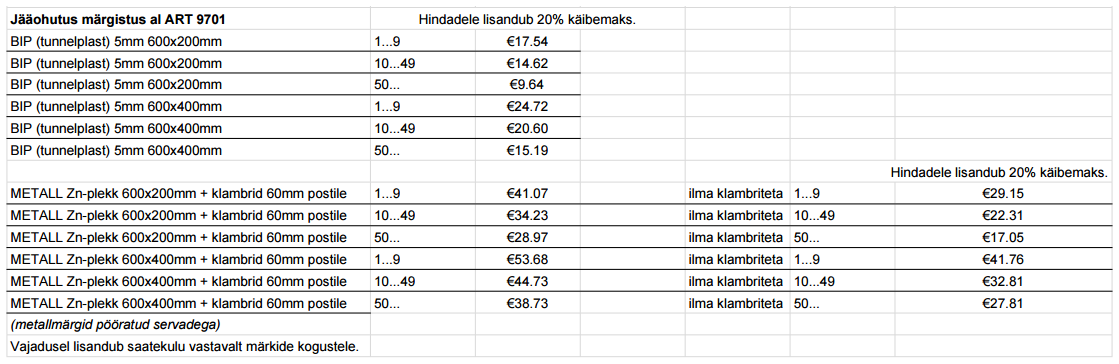 Märgised on 600x200 ja 400x600mm mõõtudes. Indikatiive hinnakiri siin st. tekstidele.