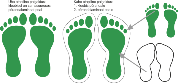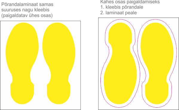 Kahekihiliselt paigaldatavad jalajälgede kleebised (klient saab kleebised kahes osas ehk esmalt kleebitakse põrandale jalajälje värviline kujutis ja siis peale läbipaistev mittelibiseva pinnaga laminaat mis on jalajäljest suurem - vt. allpool olevat joonist).